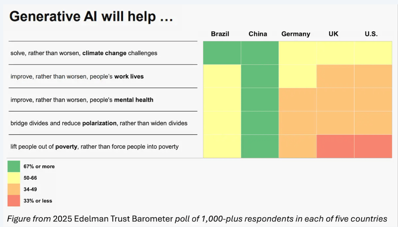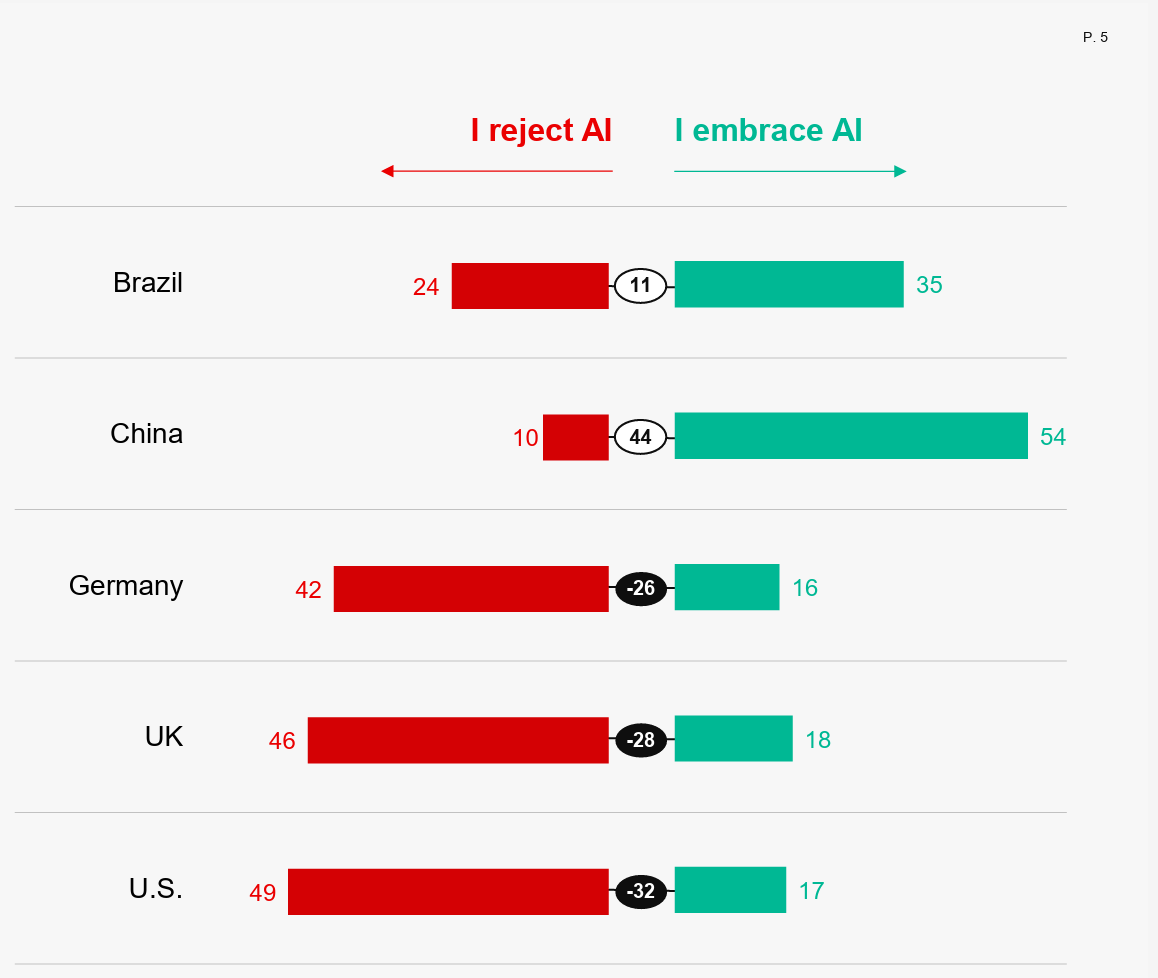 Separate surveys by Edelman and Pew Research show that AI has a serious PR problem. According to the Edelman report, 49% of US respondents and 46% of UK respondents say “I reject it” regarding the growing use of AI.